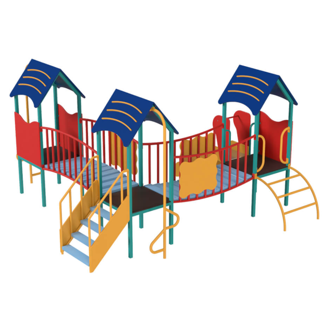 Детский комплекс Радость – отличный вариант досуга для активных малышей. Универсальный комплекс, который подойдет как для детского сада, так и для общей дворовой площадки. Комплекс содержит следующие элементы: три башни соединены между собой вогнутыми мостиками с перилами, горка, стремянка и три разных лазалки. Комплексы KIDIGO являются безопасными и надежными, а также отвечают самым высоким стандартам качества. Этот комплекс отлично подходит для детей от 3 лет. Можно использовать возле частного дома, в детских садах, а также возле жилых комплексов в городах и селах в зоне для маленьких детей.