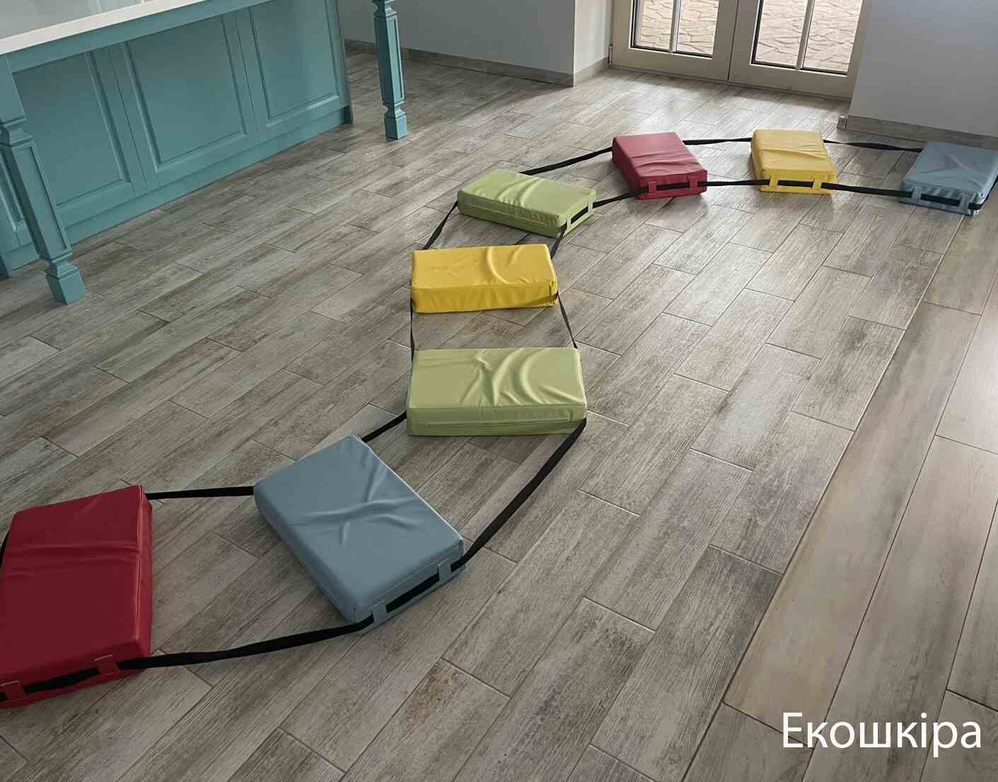 Дорожка-тренажер KIDIGO Лестница состоит из 8 прямоугольников. Элементы соединены между собой лентой. Задача участников игры – прыгать или бегать по нему.