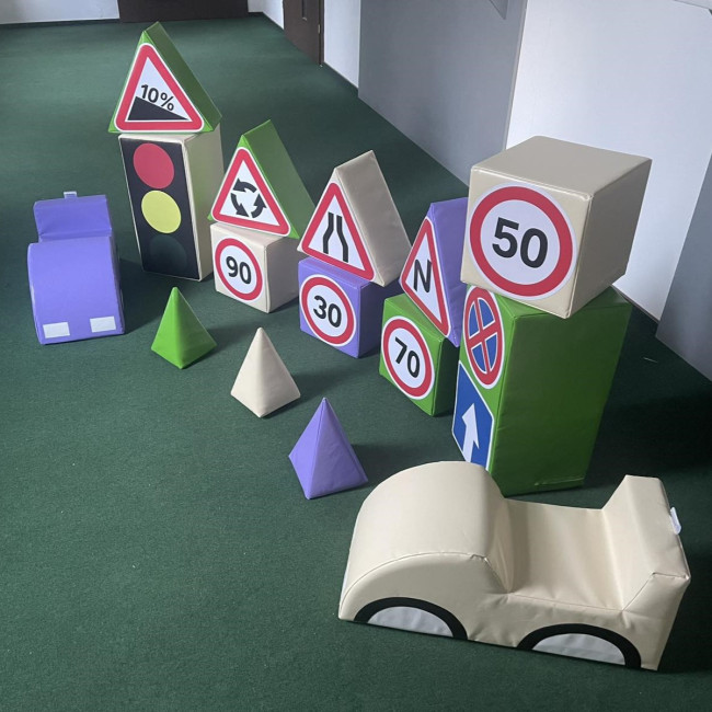 Размер(м): Машинка - 0,7х0,3х0,3, Дорожные конусы - 0,2х0,2х0,3, Светофор - 0, 3х0,6х0,3 см, Дорожный знак – 0,3х0,6х0,3, Скоростные ограничители – 0,3х0,3х0,2, Дорожные знаки – 0,4х0,4х0,2.