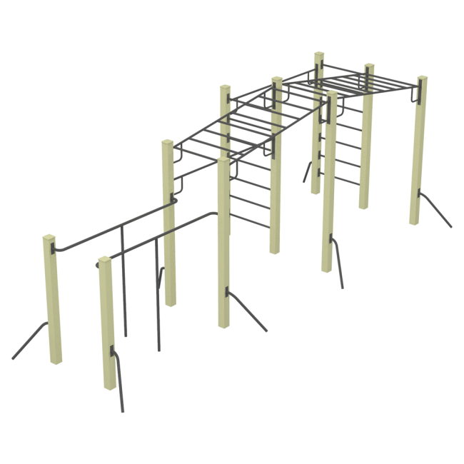 Спортивный комплекс состоит из многих разнообразных элементов, что позволяет одновременно заниматься нескольким детям. Прекрасно подойдет для спортивной зоны учебных заведений.