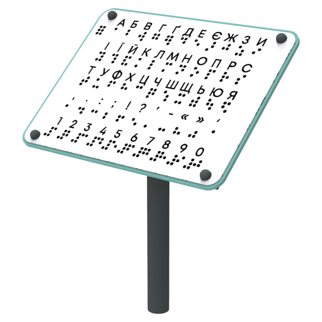Учебная доска Алфавит Брайля - элемент инклюзивного оборудования, предназначенный для изучения алфавита, цифр и математических операций. Предназначен элемент для детей с нарушениями зрения. Элемент представляет собой плоскую поверхность с рельефными точками, комбинации которых образуют коды шрифта Брайля - буквы украинского алфавита, знаки препинания, цифры и числа.